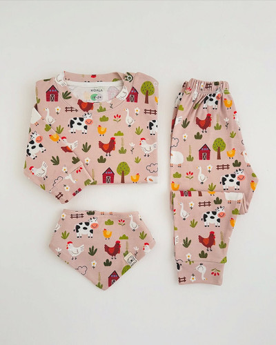 ست سه تیکه نوزادی شامل بلوز و شلوار و پیش بند سایز ۶ تا ۳۶ ماه طرح مزرعه